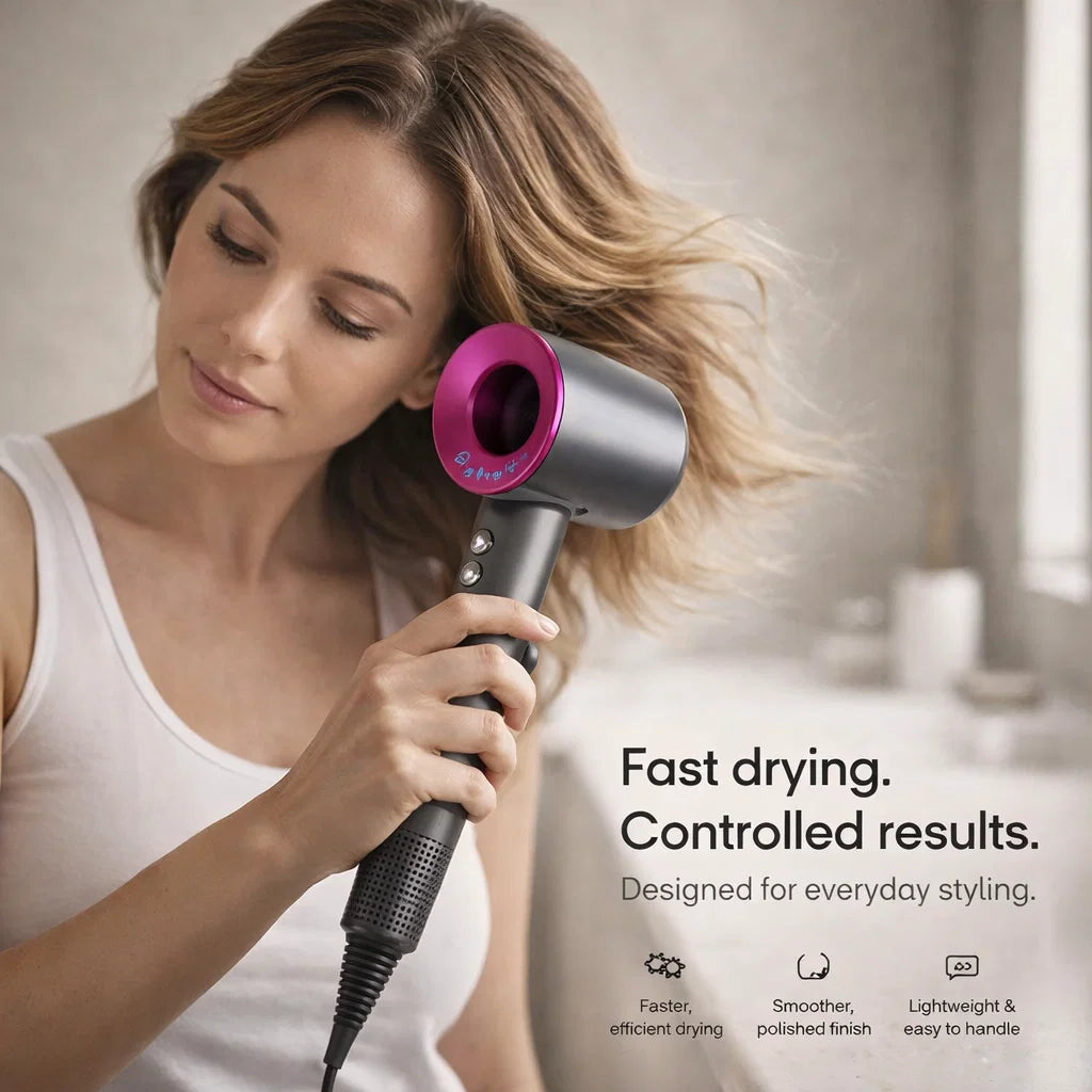 Start with towel-dried hair. Select your preferred airflow and heat setting, then gently dry hair section by section, keeping the dryer at a comfortable distance to allow even airflow and controlled styling.
